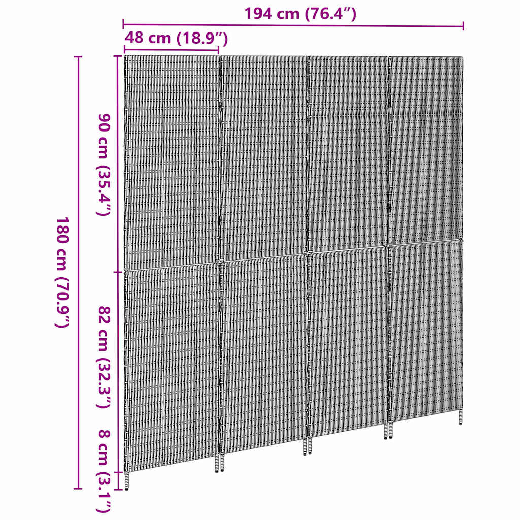 Paravent 4 panneaux pliable gris 195×180 cm en poly rotin